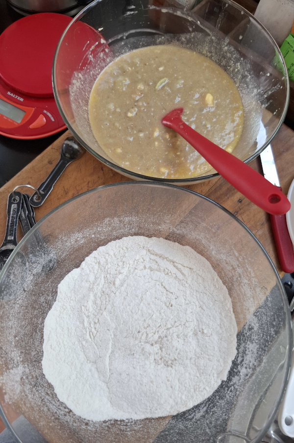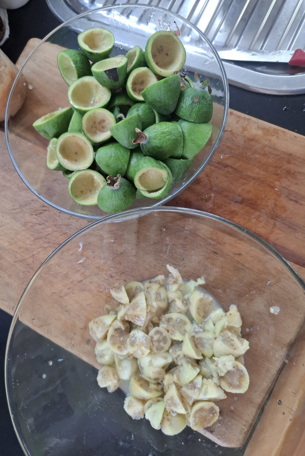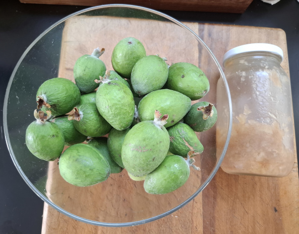 Autumn is one of my favourite times of the year as it heralds the return of the Feijoa to our fruit bowl. We have two small trees that we planted a couple of years ago. They are both different varieties and last year we got a bowl worth of fruit off them both as they were still quite small but this year they are bursting with fruit. I needed to use some of them up fast so I decided to make feijoa bread based on a banana bread recipe. I found a couple online and took the bits I liked from both of them and came up with this recipe.