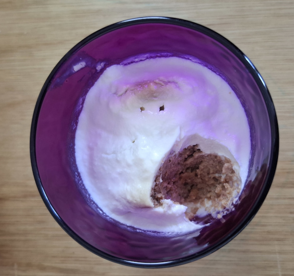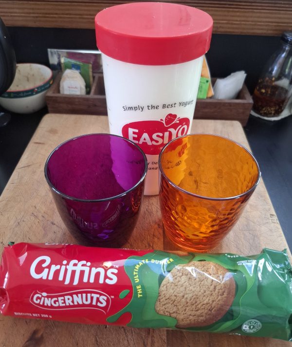 I put 6 tablespoons of yoghurt into the bottom of the glass then rammed in as many gingernuts as would fit. The yoghurt rose up to fill the glass as I did this.